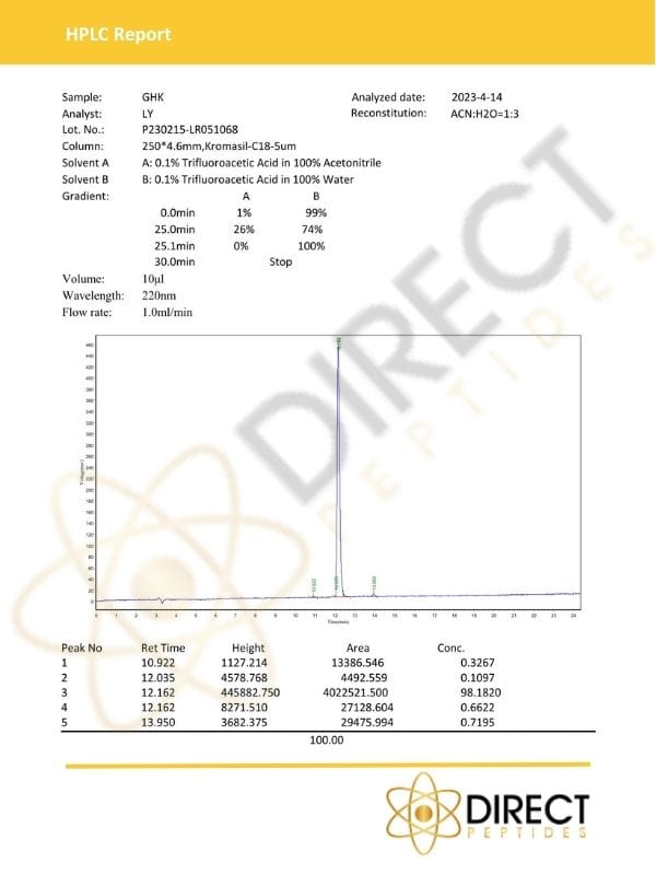 At Direct Peptides, we are committed to high-quality GHK-Cu peptides. Our approach ensures our products exceed industry standards for purity and effectiveness, with a minimum purity of 98%.