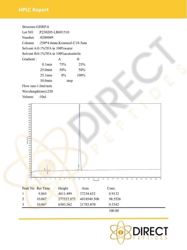 Buy GHRP-6 peptides with 99% purity from Direct Peptides. Created to the highest quality standards for research. Reliable, safe, and thoroughly tested, our products ensure consistency and support researchers in achieving accurate results.