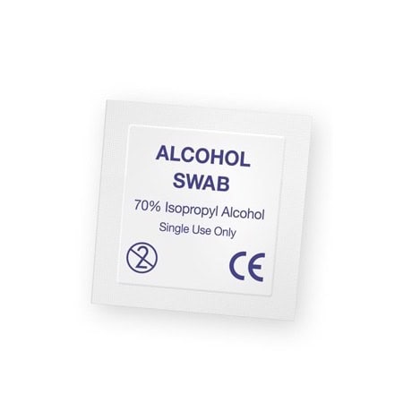 Instructions for use: The alcohol swabs should be placed slightly above the intended injected point, and should then be drawn across the injection site and in one direction. The skin should then be allowed to dry naturally prior to injection.
