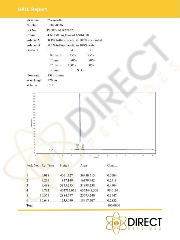 Buy Tesamorelin peptide with 99% purity from Direct Peptides, designed to support your scientific research on growth hormone and its numerous benefits.