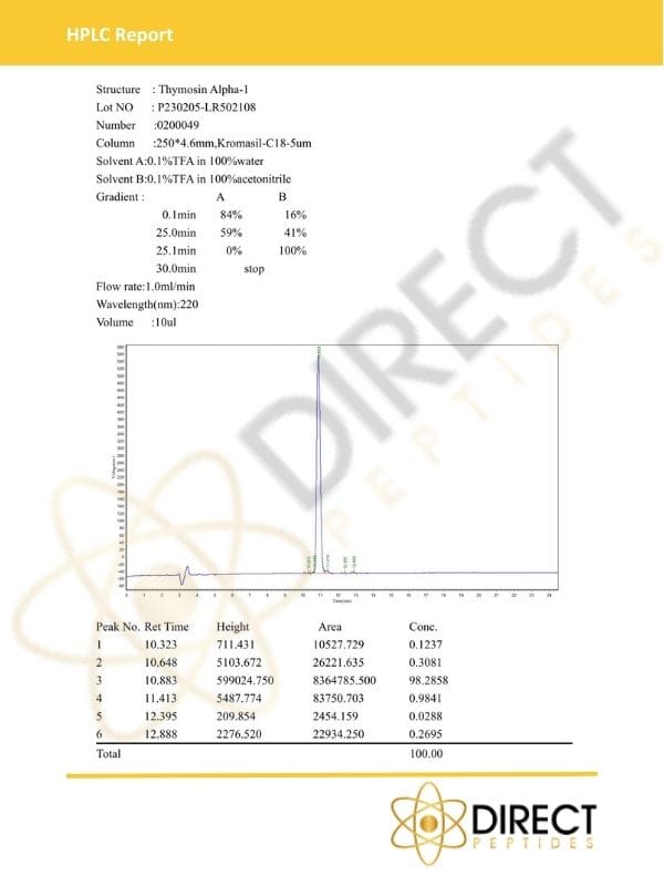 Healthcare providers can prescribe it for the treatment of hepatitis B, chronic hepatitis C, and to support cancer therapy, following local medical guidelines. Researchers using Tα1 must comply with ethical and regulatory standards. Direct Peptides is committed to providing high-quality, authentic Tα1 specifically for research applications.